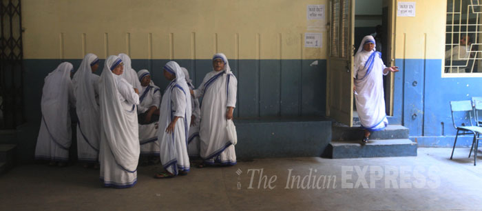 Nuns of missionaries of charityat a polling booth in Central Kolkata. Voting for Kolkata Municipal Corporation goes on amidst reports of stray incidents of violence. A total of 37, 53,256 electors including 17.52 562 women are likely to exercise their franchise across 4,704 polling stations to decide to fate of 1075 candidates on Saturday (April 18). The security of the polling premises is being maintained mostly by Kolkata Police in absence of central forces. The counting for the 144 ward civic body is scheduled on April 28. (Express Photo by Partha Paul)