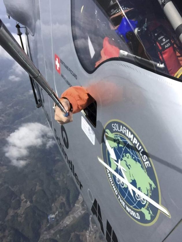 Swiss pilot Bertrand Piccard takes a selfie with his arm outside the Solar Impulse 2 plane during the sixth leg of the round-the-world trip, from Chongqing Jiangbei International Airport to Nanjing Lukou International Airport in Jiangsu province, in China, in this April 21, 2015 handout photograph released by Solar Impulse. Pilots Piccard and Andre Borschberg will take turns at the controls of Solar Impulse 2, which began its journey in Abu Dhabi in the United Arab Emirates last month, as it makes its way around the globe in about 25 flight days at speeds of between 50 kph and 100 kph (30 mph to 60 mph). (Source: Reuters)