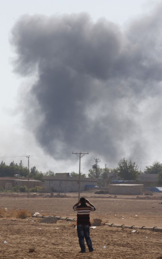 Smoke rises following an airstrike by the US-led coalition aircrafts in Kobani, Syria, during fighting between Syrian Kurds and the militants of Islamic State group, as seen from the outskirts of Suruc, on the Turkey-Syria border, Friday, Oct. 10, 2014. The buildings bottom, including a factory, bottom left, are within Turkey. Kobani, also known as Ayn Arab, and its surrounding areas, has been under assault by extremists of the Islamic State group since mid-September and is being defended by Kurdish fighters. (Source: AP)
