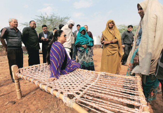 Vasundhara Raje is seen listening to problems of villagers at a village in Dhaulpura district, Rajasthan. (IE Photo: Ravi Kanojia)