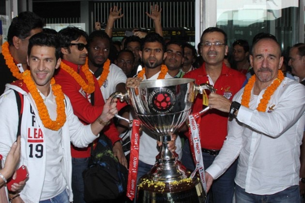 The Spanish connection: The club has tie-up with Spanish champions Atletico Madrid. Spaniards Luis Garcia and coach Antonio Lopez Habas seen here with the trophy. (Source: IE Photo by Partha Paul)