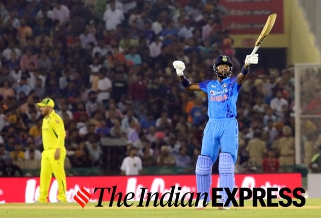 Hardik Pandya celebrates scoring fifty runs during the first T20 cricket match between India and Australia, in Mohali. (Express Photo by Kamleshwar Singh)