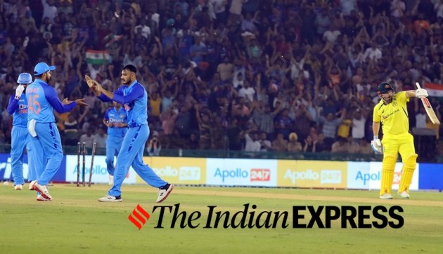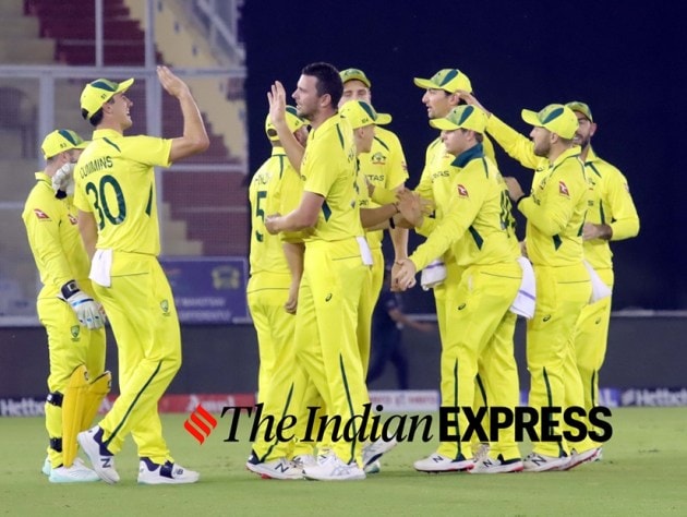 Josh Hazelwood celebrates during the 1st T20 match against India PCA Cricket Stadium in Mohali on Tuesday. (Express Photo by Kamleshwar Singh)