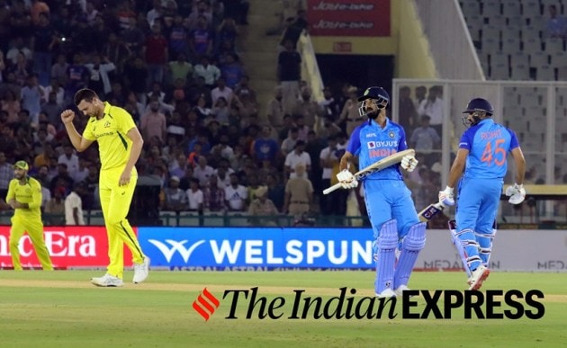 Josh Hazelwood celebrates the wicket of Rohit Sharma during the 1st T20 against India at PCA Cricket Stadium in Mohali on Tuesday. (Express Photo by Kamleshwar Singh)