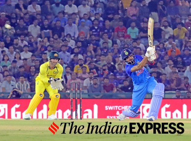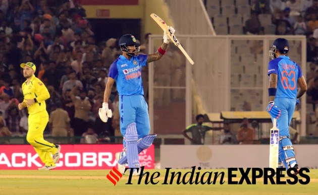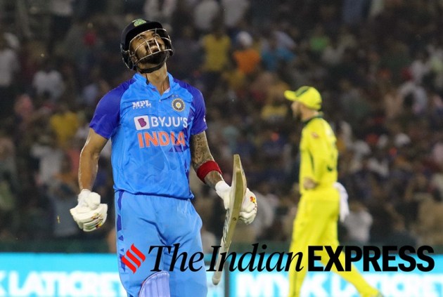 Indian player KL Rahul plays a shot during the 1st T20 match against Australia at the PCA Cricket Stadium in Mohali on Tuesday. (Express Photo by Kamleshwar Singh)