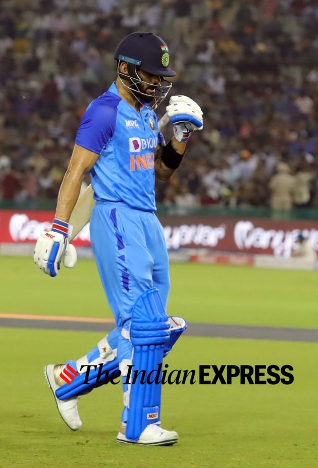 Virat Kohli walks back after getting dismissed during the 1st T20 match at PCA Cricket Stadium in Mohali on Tuesday. (Express Photo by Kamleshwar Singh)