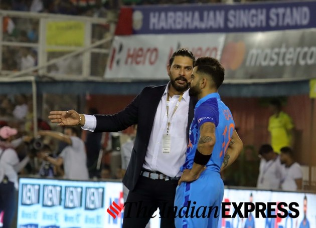 Yuvraj Singh with Virat Kohli before the 1st T20 match against Australia at the PCA stadium in Mohali. (Express Photo by Kamleshwar Singh)
