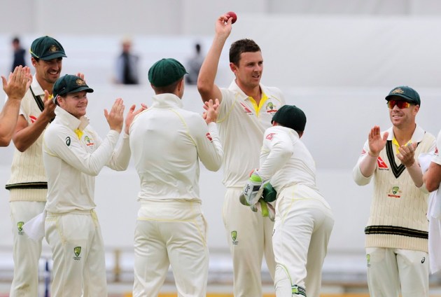 Hazlewood claimed his fifth victim of the match when tail-ender Craig Overton was taken in the gully for 12 where Usman Khawaja took a fine low catch. (Source: AP)