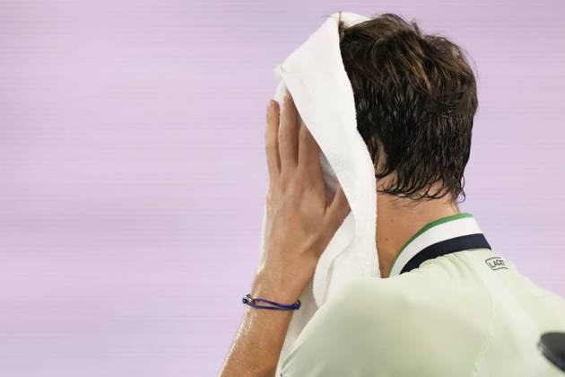 Daniil Medvedev of Russia wipes the sweat from his face during a break in his semifinal against Stefanos Tsitsipas of Greece at the Australian Open tennis championships in Melbourne, Australia. (AP Photo)