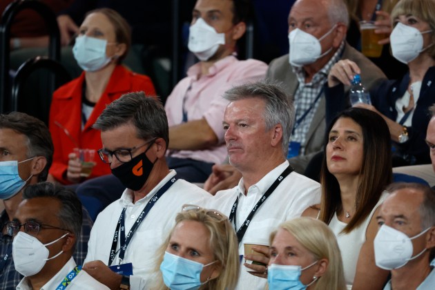 Former Australian cricket captain Steve Waugh, center, watches the Stefanos Tsitsipas of Greece and Daniil Medvedev of Russia semifinal match at the Australian Open tennis championships in Melbourne, Australia. (AP Photo)