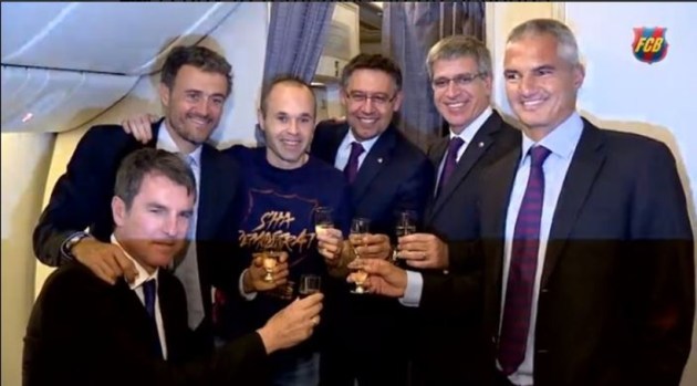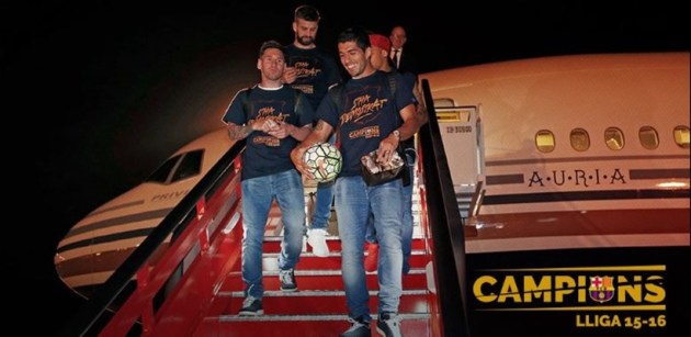 Champions Barcelona returned back home wearing Tshirts which said 'Champions' in Catalan. (Source: Twitter)
