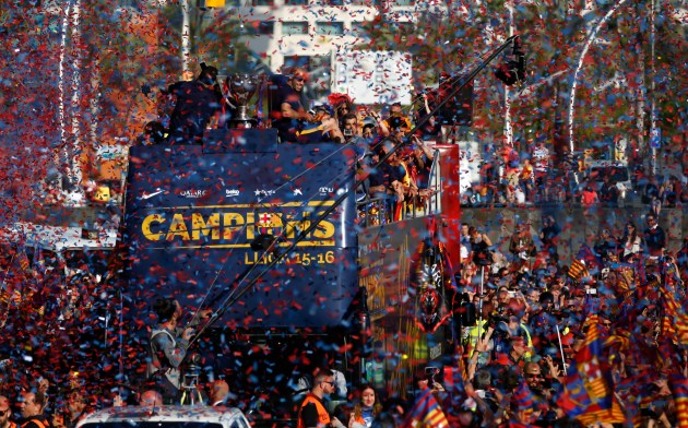 La Liga champions Barcelona celebrated its 24th Spanish league title with a two-hour parade through city streets on Sunday. Thousands of fans on sidewalks and plazas in the Catalan capital cheered the players in their open-top bus which went on a route of about 3 kilometers (2 miles). Lionel Messi, Neymar, Luis Suarez and Gerard Pique were among players to wave to supporters and jump up and down with coach Luis Enrique to celebrate the club's second straight title. (Source: AP)