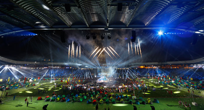 Athletes waves and hold flags as they watch the the Closing Ceremony for the Commonwealth Games Glasgow 2014.(Source: AP)
