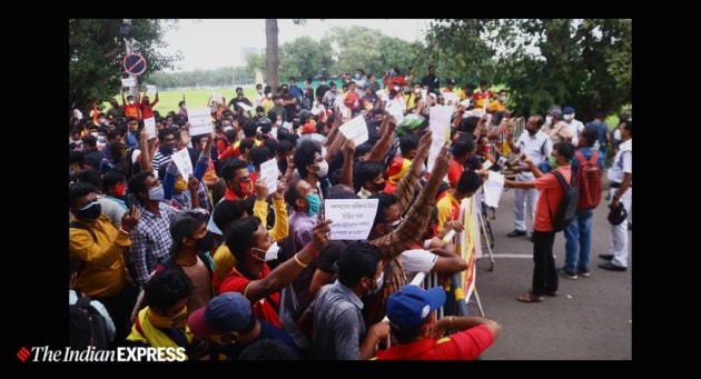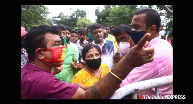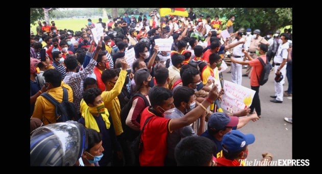 Two groups of East Bengal supporters clashed against each other near the club tent at the Maidan on Wednesday, flouting COVID-19 protocols, in the wake of the Indian Super League side's impasse with investors Shree Cement Ltd. (Express Photo by Shashi Ghosh)