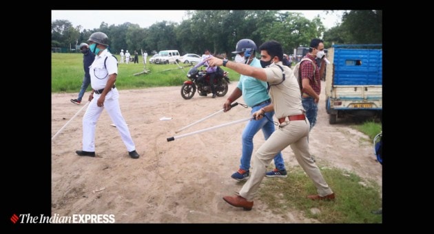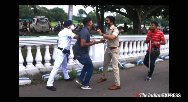Police attack a supporter near the East Bengal club tent in Maidan area on Wednesday afternoon. (Express Photo by Shashi Ghosh)