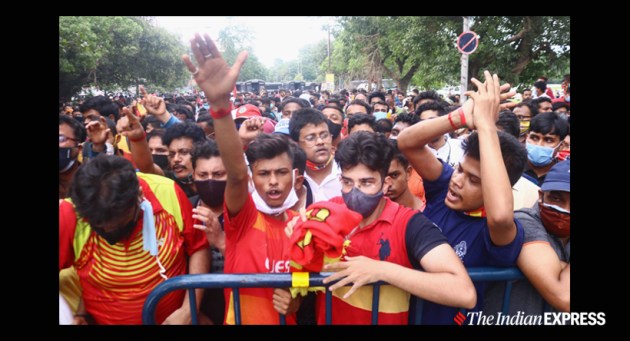 Trouble started brewing in the afternoon when supporters under the banner of 'East Bengal Real Power' and other fan clubs started gathering for a pre-planned protest against the authorities and started shouting slogan. With placards in their hands, the supporters also demanded intervention from chief minister Mamata Banerjee yet again. (Express Photo by Shashi Ghosh)