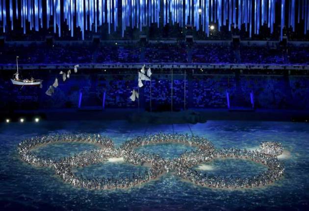 In a charming touch, the Sochi organizers used the ceremony to make a joke at their own expense. Dancers in shimmering silver costumes formed themselves into four rings and a clump in the center of the stadium. (Reuters)