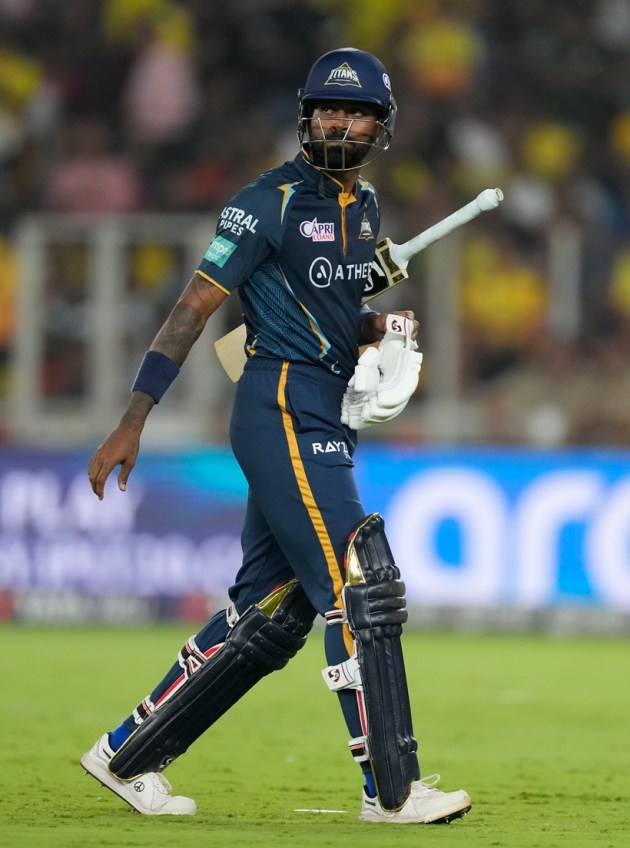 Gujarat Titans' captain Hardik Pandya leaves the field during the Indian Premier League (IPL) match between Gujarat Titans and Chennai Super Kings in Ahmedabad, India, Friday, March 31, 2023. (AP Photo/Ajit Solanki)
