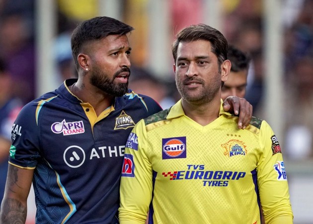 Gujarat Titans captain Hardik Pandya and Chennai Super Kings captain Mahendra Singh Dhoni before the start of the IPL 2023 cricket match between Chennai Super Kings and Gujarat Titans, at Narendra Modi Stadium, in Ahmedabad, Friday, March 31, 2023. (PTI Photo/Kunal Patil)
