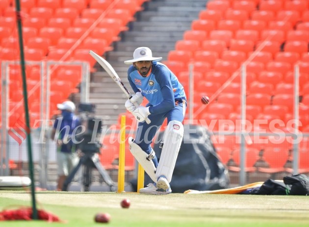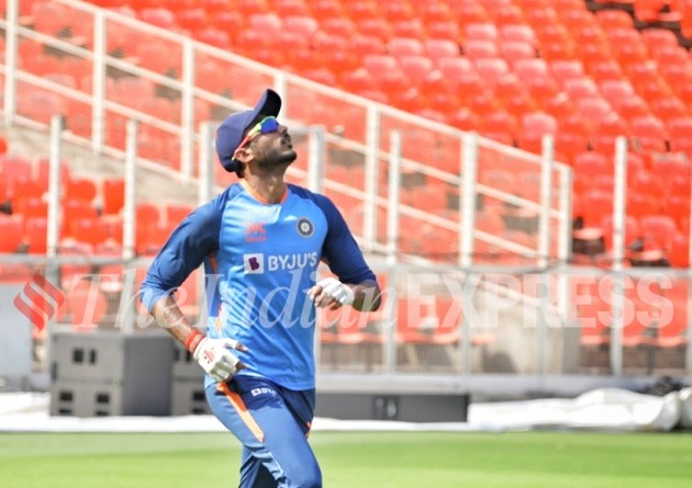 Indian spinner Axar Patel during a practice session at Narendra Modi stadium ahead of India vs Australia 4th Test match in Ahmedabad. (Express photo by Nirmal Harindran)