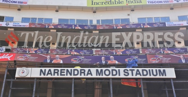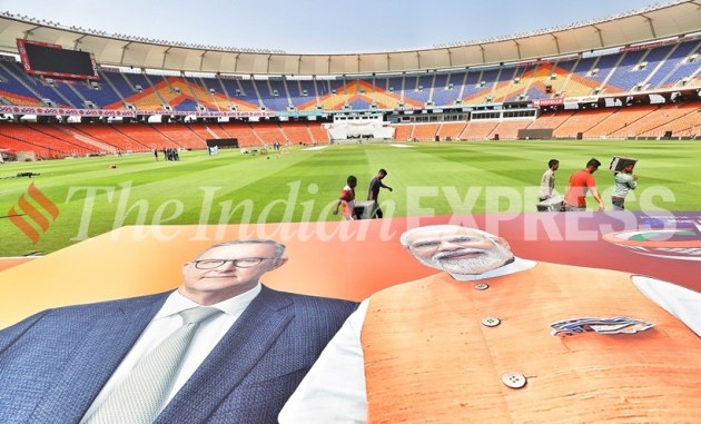 Poster welcoming Australian PM Anthony Albanese and PM Narendra Modi at the Narendra Modi stadium in Ahmedabad ahead of India vs Australia 4th Test match. (Express photo by Nirmal Harindran)