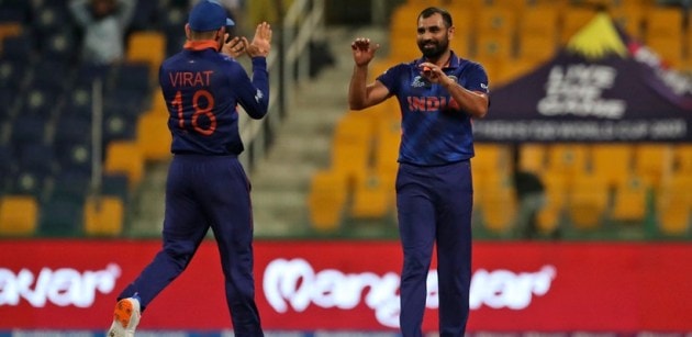 India's Mohammed Shami, right, celebrates with India's captain Virat Kohli the dismissal of Afghanistan's Mohammad Shahzad during the T20 World Cup match between India and Afghanistan in Abu Dhabi. (AP Photo)