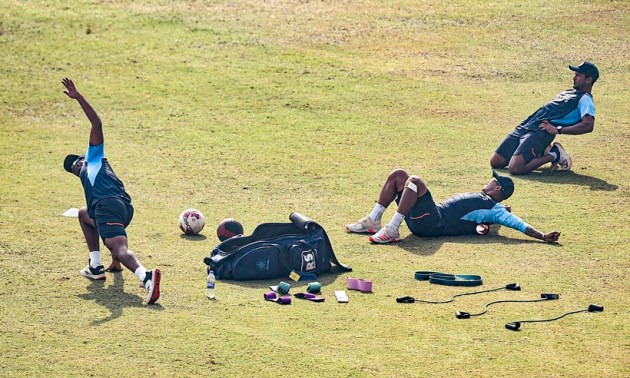 India players stretcg during a practice session, ahead of the first Test against New Zealand in Kanpur. (PTI)