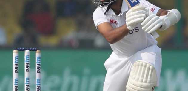 Iyer picked his moments against the spinners as he struck seven fours and two sixes. He reached his maiden test half-century off 94 balls. (AP Photo)