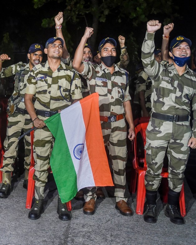 CISF jawans watch the India-Pakistan T20 World Cup match, at CISF camp in Mumbai, Sunday. (PTI)