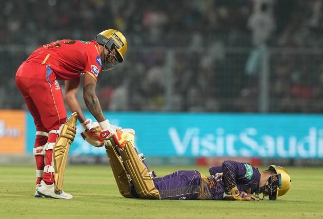 Kolkata: Punjab Kings batter Shikhar Dhawan assists Kolkata Knight Riders wicket-keeper Rahmanullah Gurbaz during the IPL 2023 cricket match between Kolkata Knight Riders and Punjab Kings, at Eden Gardens in Kolkata, Monday, May 8, 2023. (PTI Photo/Swapan Mahapatra)
