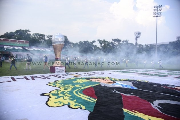 Seven months after they emerged I League champions, Mohun Bagan players were finally presented the glittering winner's trophy at a ceremony, in Kolkata on Sunday. (Source: Mohun Bagan Twitter)