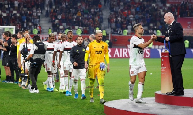 Flamengo's Diego receives a medal from FIFA president Gianni Infantino after losing the final. (Source: Reuters)