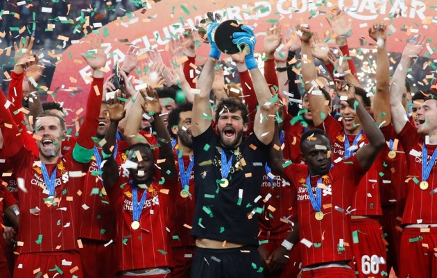 Liverpool's Alisson Becker lifts the trophy as they celebrate after winning the Club World Cup. (Source: Reuters)