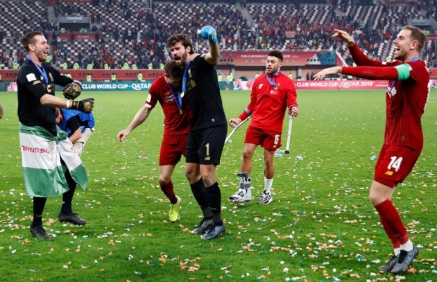 Liverpool's Adrian, James Milner, Alisson, Alex Oxlade-Chamberlain and Jordan Henderson celebrate after winning the Club World Cup. (Source: Reuters)