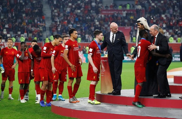 Liverpool's Sadio Mane is embraced by Liverpool CEO Peter Moore as Sheikh Joaan bin Hamad Al Thani and FIFA president Gianni Infantino look on during the medal presentation. (Source: Reuters)