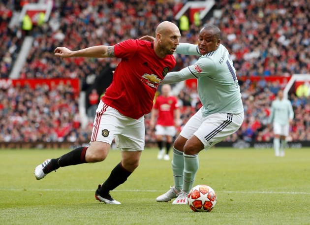 Despite being a charity event, Jaap Stam's ruthless defending saw three Bayern players falling on the pitch in a 10-second cameo. (Reuters)