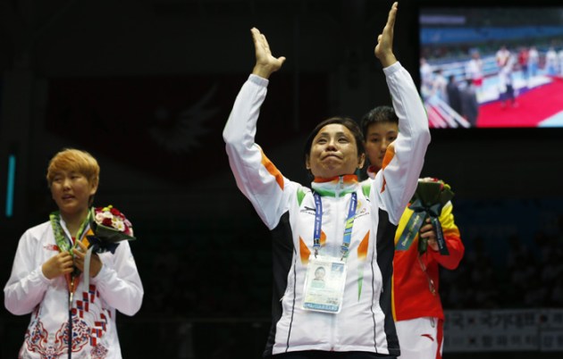 Sarita acknowledges the crowd after she gave her bronze medal to the Korean boxer at the medal ceremony. (Source: PTI)