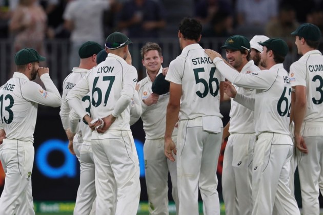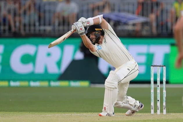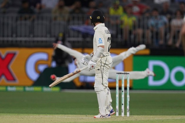 New Zealand’s captain fell to a spectacular one-handed, diving catch by Steve Smith at second slip. The dismissal re-established Australia’s control in the contest. (AP Photo)