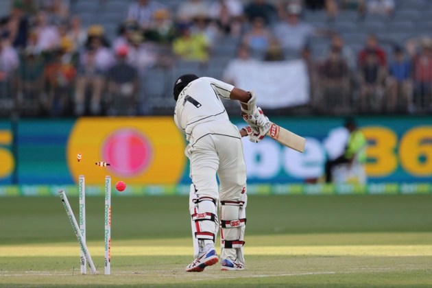Mitchell Starc tore through New Zealand’s batting-order shortly before stumps on a dramatic day two, as the hosts gained a stranglehold of the first test on Friday. In reply to Australia’s first innings of 416, New Zealand teetered at 109 for five at the close with veteran Ross Taylor unbeaten on 66 and BJ Watling yet to score. (AP Photo)