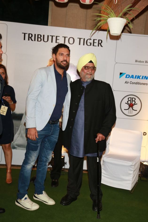 The Bishan Bedi Cricket Coaching Trust in Delhi organised an event ‘Tribute to Tiger’ to pay tribute to the life of former cricketer Nawab Mansoor Ali Khan Pataudi, often referred to as 'Tiger Pataudi'. Yuvraj Singh, Virender Sehwag and other eminent cricket personalities were present at the event "Tribute to Tiger". (Source: APH)