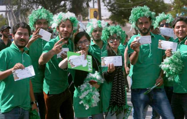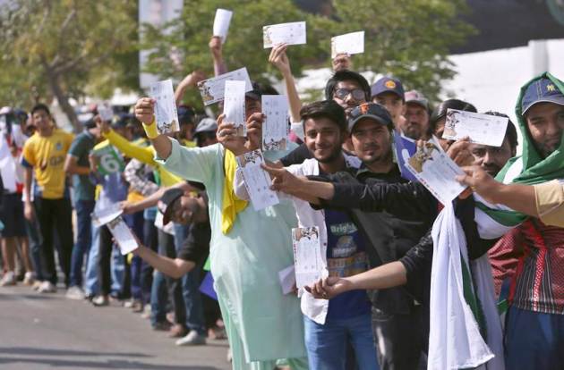 Cricket fans display their tickets for Pakistan Super League final cricket match at National stadium in Karachi, Pakistan, Sunday, March 25, 2018. (Source: AP)