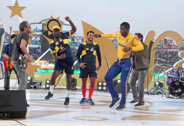West Indies cricketers Darren Sammy, right, Andre Fletcher, second left, and Pakistani cricketer Hassan Ali, center, dance during a music show prior to start of the Pakistan Super League final cricket match at National stadium, in Karachi, Pakistan, Sunday. (Source: AP)