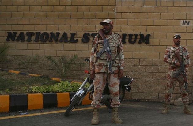 Pakistani para-military personnel stand guard outside the National stadium, a venue for the final of Pakistan Super League cricket match in Karachi. (Source: AP)
