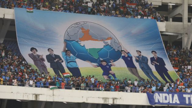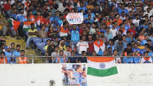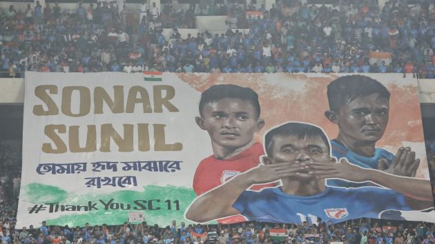 The Kolkata crowd with a tifo tribute to the Indian football captain during the India-Kuwait game at the Salt Lake Stadium. (Express photo by Partha Paul)