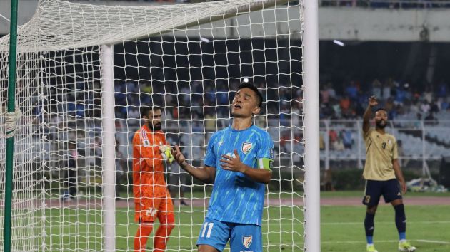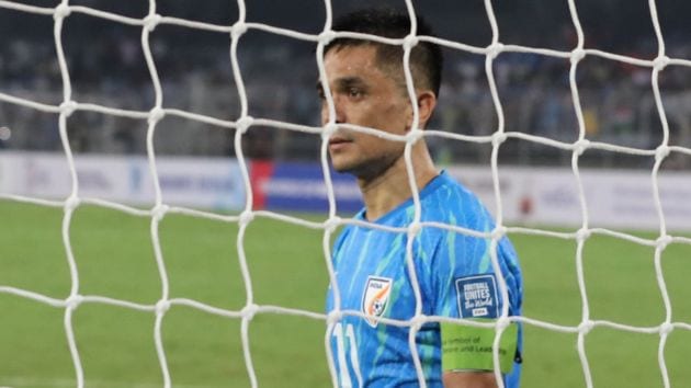 A dejected Chhetri after a chance goes begging against Kuwait during India's FIFA World Cup Qualifiers game at the Salt Lake Stadium in Kolkata. (Express photo by Partha Paul)