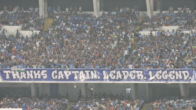 The Kolkata crowd brought in a banner to pay tribute to the Indian football captain during the India-Kuwait game at the Salt Lake Stadium. (Express photo by Partha Paul)