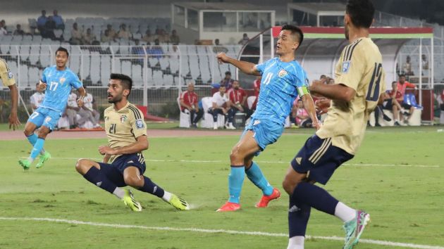 Chhetri vyes for possession during the India-Kuwait FIFA World Cup Qualifiers game in Kolkata. (Express photo by Partha Paul)