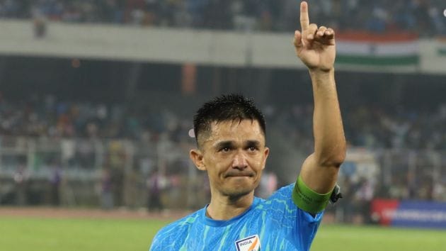 Sunil Chhetri in tears after the India-Kuwait FIFA World Cup Qualifiers game, his last international match at the Salt Lake Stadium in Kolkata. (Express photo by Partha Paul)