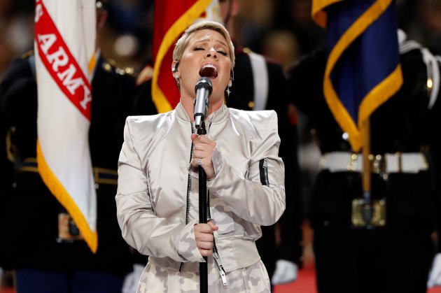 Pink performs the national anthem before the game. (Source: Reuters)