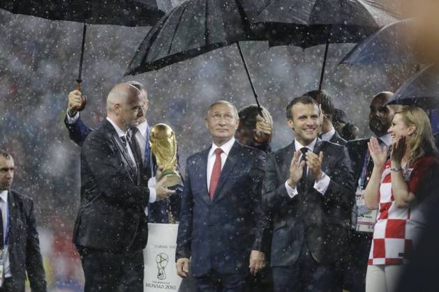 From left to right, FIFA President Gianni Infantino, Russia's President Vladimir Putin, France's President Emmanuel Macron and Croatia's President Kolinda Grabar-Kitarovic stand under the pouring rain during the awards ceremony after final match between France and Croatia at the 2018 soccer World Cup in the Luzhniki Stadium in Moscow, Russia, Sunday, July 15, 2018. (AP Photo/File)